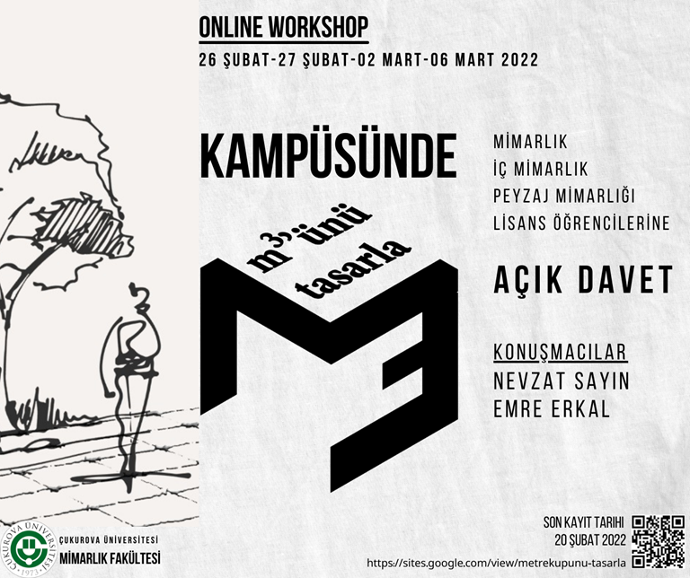 Çukurova Üniversitesi Mimarlık Fakültesi tarafından düzenlenen Ulusal “Kampüsünde m3’ünü Tasarla” Çalıştayı, 26 Şubat - 6 Mart 2022 tarihleri arasında çevrim içi olarak yapılacaktır.