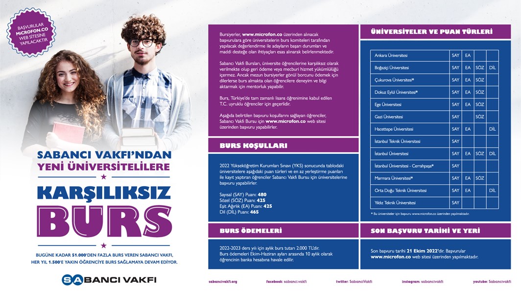 Sabancı Vakfı Üniversiteye Giriş Bursu başvuruları www.microfon.co web sitesinden alınacaktır. Son başvuru tarihi 21 Ekim 2022 olarak belirlenmiştir.