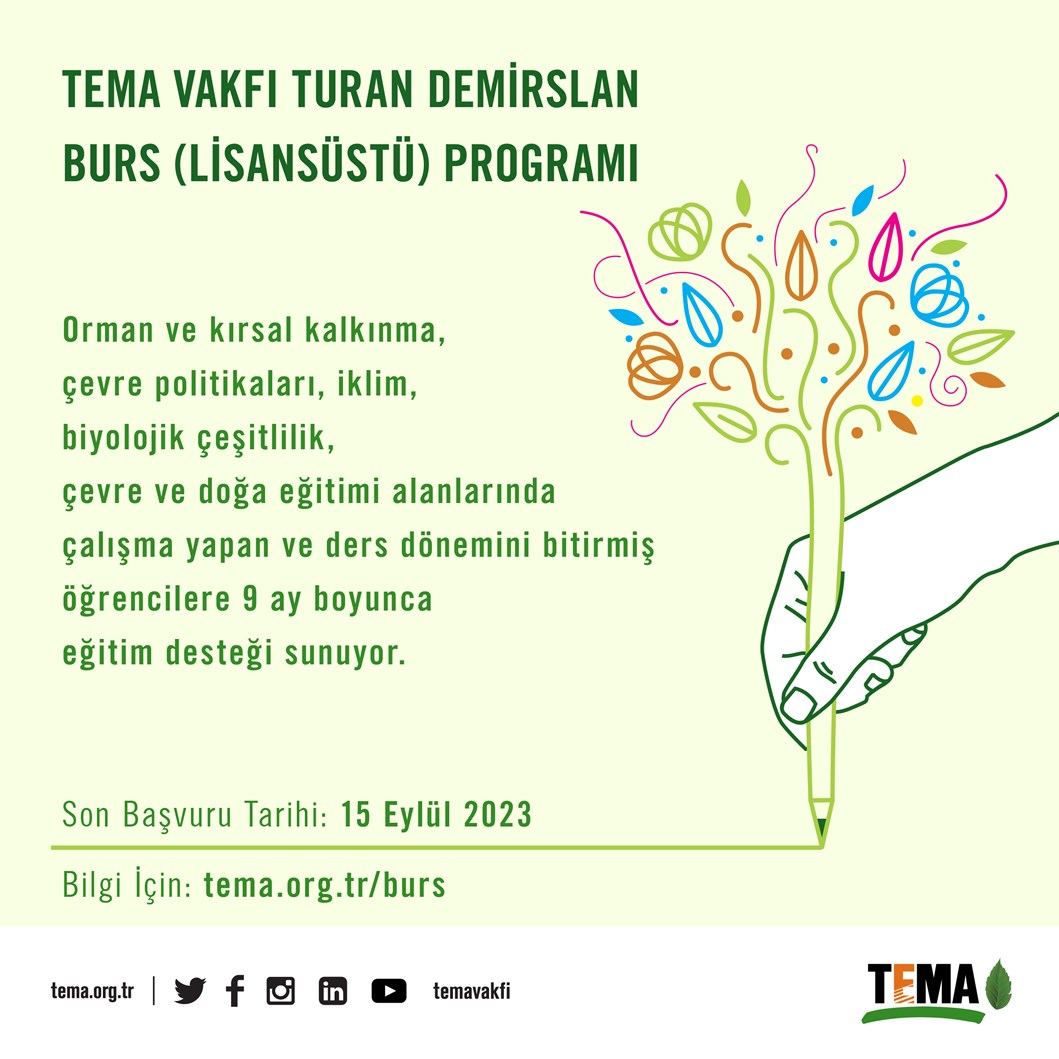 TEMA Vakfı Turan Demiraslan Burs ( Lisansüstü ) Programı kapsamında, orman ve kırsal kalkınma, çevre politikaları, iklim, biyolojik çeşitlilik, çevre ve doğa eğitimi alanlarında çalışma yapan ve ders dönemini bitirmiş maddi desteğe ihtiyacı olan yüksek lisans ve doktora öğrencilerine 9 ay boyunca eğitim desteği sağlanacaktır.